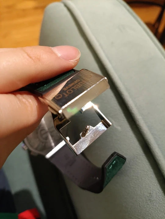From the second hand to the dial markers, the green highlights energize the design — matched with a green-stitched strap for edge and elegance.
